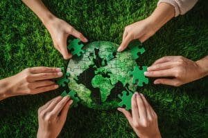 Hands putting together a green puzzle globe on green grass