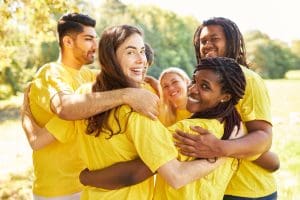 Multikulturelles Start-Up Team umarmt sich im Workshop