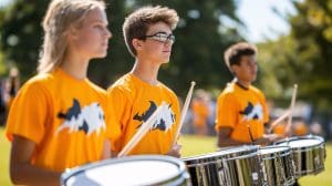 Accueil » Tous dans le tempo » Young Musicians in Marching Band Uniforms Playing Drums at Outdoor Performance with Focus and Team Spirit on a Bright Day